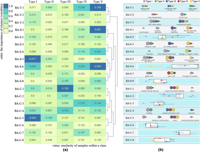 In this diagram, rows represent Ganlan spatial attribute variables (BA-S series) and construction attribute variables (BA-C series), columns correspond to Ganlan types (I–V) and their sub-clusters, and the blue-to-orange color gradient indicates the degree of association between variables and clusters (0.00–1.00).