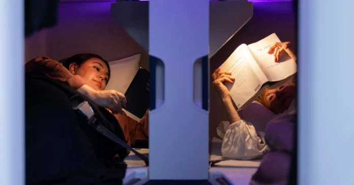 Each berth is about the length of a regular bed — 80 inches — but the pods don’t leave headroom for sitting up and access “requires bending, kneeling, crawling, or climbing into the space,” the aircraft’s website says. The bunks are 25 inches wide at shoulder height, tapering to 16 inches at the foot of the beds.