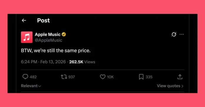 In a post on social media today, Apple Music decided to poke a little fun: “BTW, we’re still the same price.”