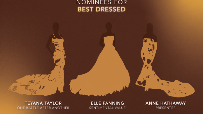 The biggest night in Hollywood wouldn’t be complete without its iconic red carpet fashion. Arguably one of the best looks of the night came from Teyana Taylor, who was nominated for Best Supporting Actress from her role in “One Battle After Another.” She stunned the red carpet in a black-and-white chiffon gown, embroidered with crystals and pearls. The bodice of the dress was a sheer material, which had feathers shaping the skirt all the way down to the train of the dress. This look was accompanied by Tiffany and Co. diamond accessories and her staple pixie cut.