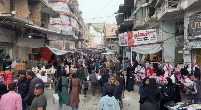 A young Palestinian man in a red sweatshirt and white cap sells snacks and candy from a makeshift stall in a crowded market in Khan Younis, Gaza.