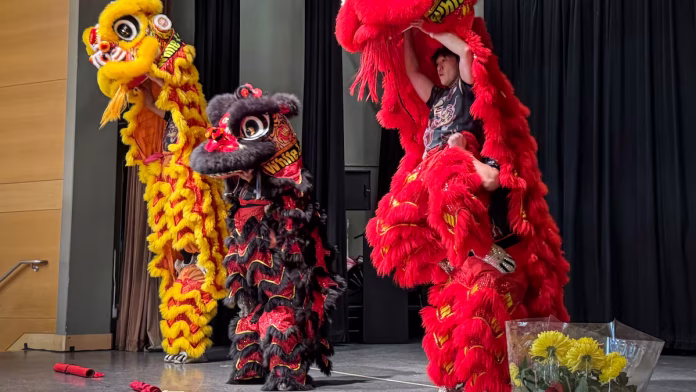 Portland Chinese School students perform traditional lion dance at the opening of the school’s Lunar New Year party, held at Portland State University’s Smith Memorial Student Union ballroom on Feb. 15, 2026.