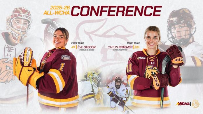 Two University of Minnesota Duluth women’s hockey players earned spots on the All-Western Collegiate Hockey Association teams announced on Thursday. Ève Gason picked up her second-consecutive All-WCHA First Team honor, while Caitlin Kraemer follows up her All-WCHA Rookie Team honor from last season with an All-WCHA Third Team selection.