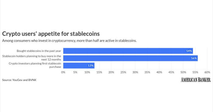 A recent YouGov survey of more than 4,600 cryptocurrency consumers in 15 countries funded by crypto technology firm BVNK found that 54% have held stablecoins over the past 12 months. Fifty six percent of those holding stablecoins plan to increase their stablecoin holdings in the next 12 months, while 13% of crypto users who have not held stablecoins in the last year plan to add the digital asset in the next 12 months.