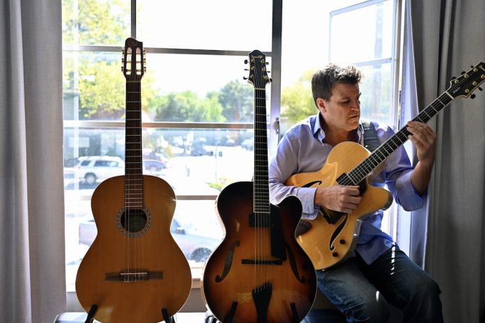 He plays acoustic and electric guitar with a collection of 15 guitars.